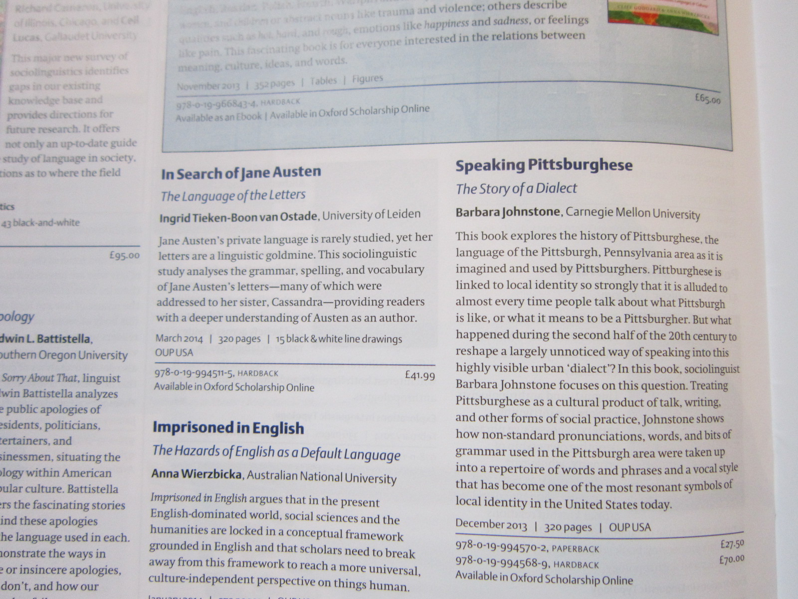 Earlier this week, my book In Search of Jane Austen: The Language of the Letters (OUP) was published. This is how it is described in the OUP linguistics catalogue that came in today: