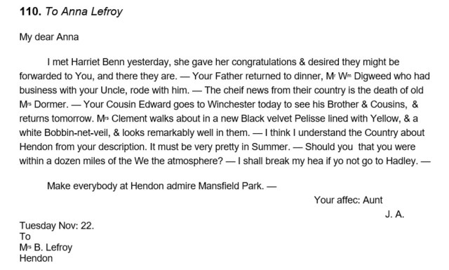 Heel anders van toon is de andere brief (brief 110 in Le Feye’s editie), gericht aan haar nichtje Anna Lefroy (de oudste dochter van haar broer James). Een half velletje maar, met een gat in de tekst doordat iemand er ooit het zegel uit had geknipt. Helaas! Aan de achterkant konden we het adres zien, en de brief is gericht aan ‘Mrs B. Lefroy’ in Hendon. Als we goed naar de datum kijken, in het licht van de geschiedenis van de family Austen, zien we dat Anna en Benjamin twee weken eerder waren getrouwd, en in de brief brengt Jane de gelukwensen over van Harriet Benn. Het gat in de tekst is zo goed mogelijk ingevuld door Deirdre Le Faye. De brief eindigt met de woorden “Make everybody at Hendon [waar Anna nu dus woonde] admire Mansfield Park” – dat was namelijk net uitgekomen.