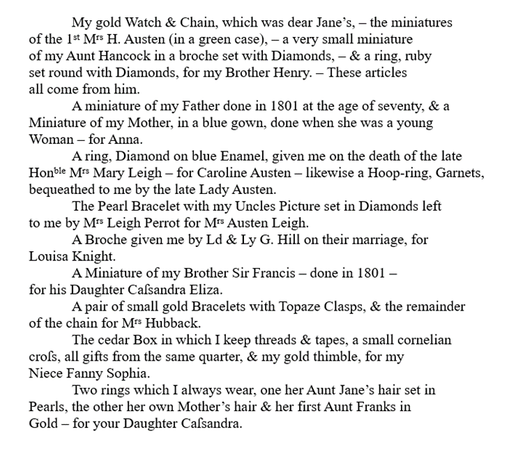 Cassandra Elizabeth, Jane Austen’s sister (1773–1845), not only left a Will but also a private document in the form of a letter to her brother Charles, in which she specified who were to inherit her most prized personal possessions. The contents of the letter are summarised in Deirdre Le Faye’s Chronology of Jane Austen and her Family 1600–2000 (2013), an amazing book because of its enormous scope and detailed descriptions of the documents relating to the Austen family. The book is a must for anyone doing research on Jane Austen and her close relatives.